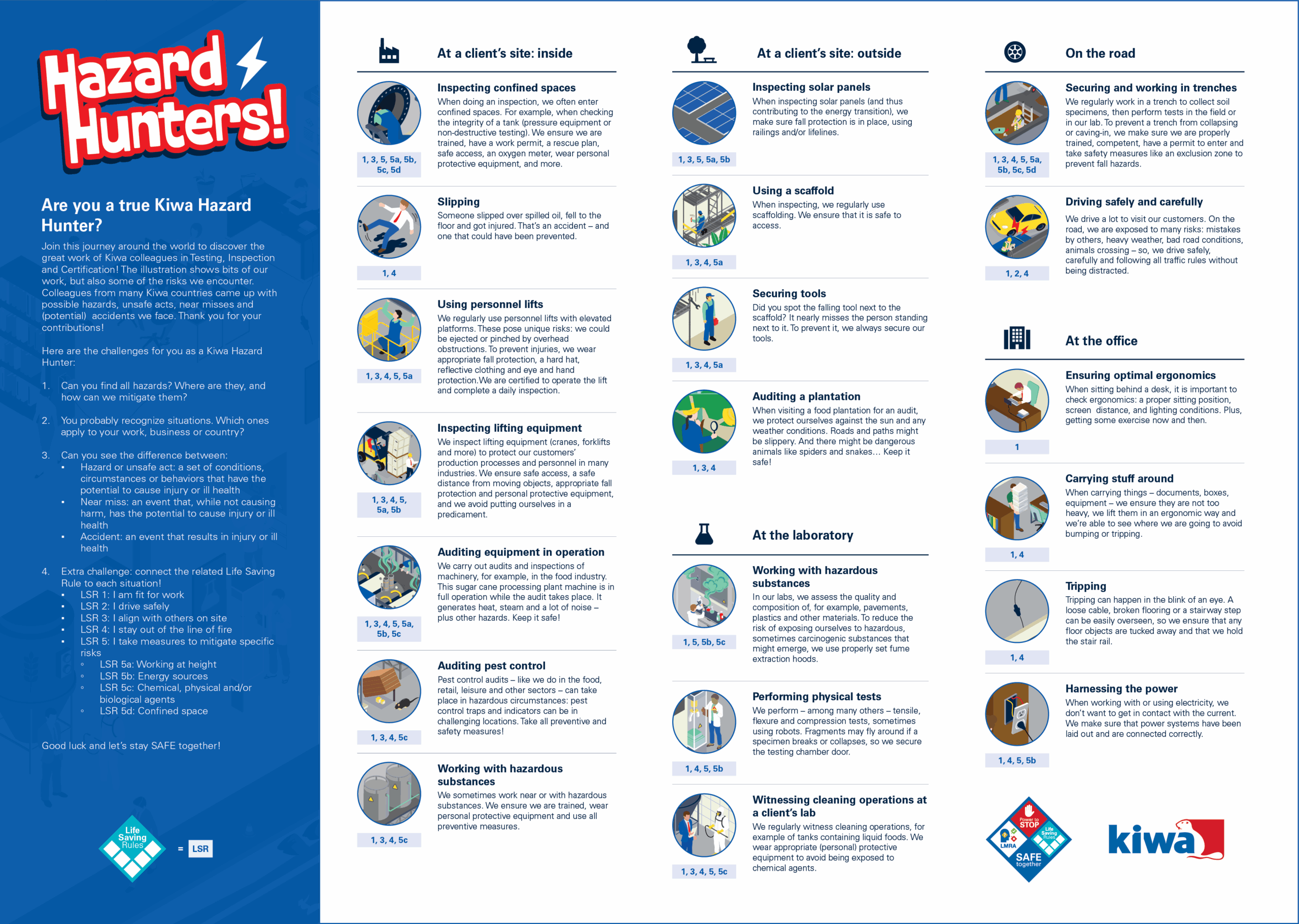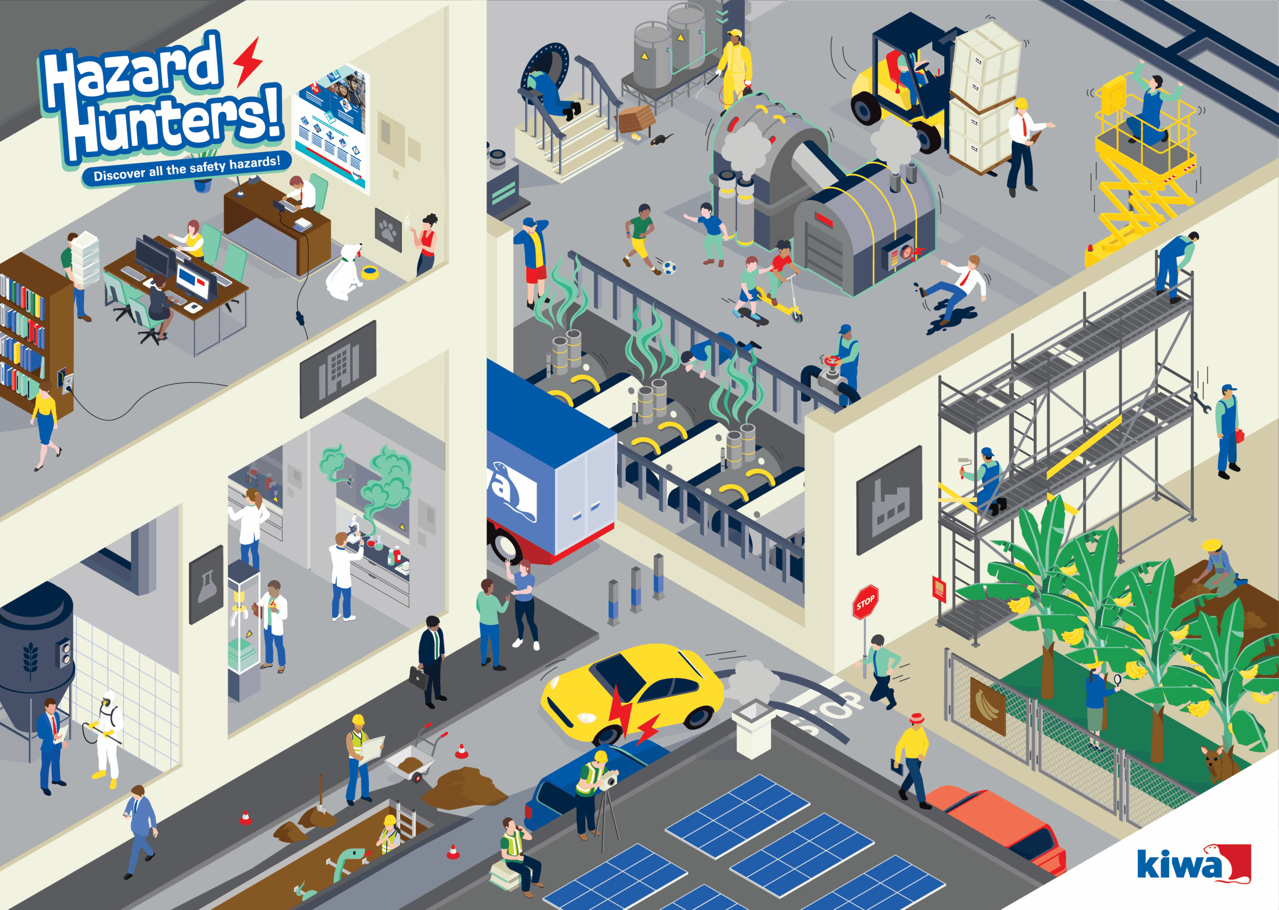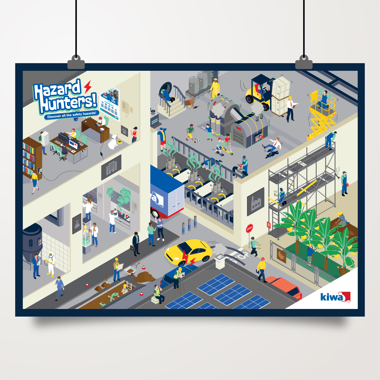 Om de veiligheid van Kiwa-medewerkers te waarborgen, werd mij, in dienst van UP Learning, gevraagd een poster te ontwerpen waarop medewerkers op zoek kunnen gaan naar de veelvoorkomende hazards binnen het bedrijf. Omdat Kiwa een groot, wereldwijd opererend bedrijf is, variëren de situaties op de poster van herkenbare kantoormomenten tot speelse verwijzingen, zoals een verborgen kangoeroe. Op de achterkant van de poster zijn alle gevaren nog eens toegelicht en gelabeld aan de bijbehorende Life Saving Rule.